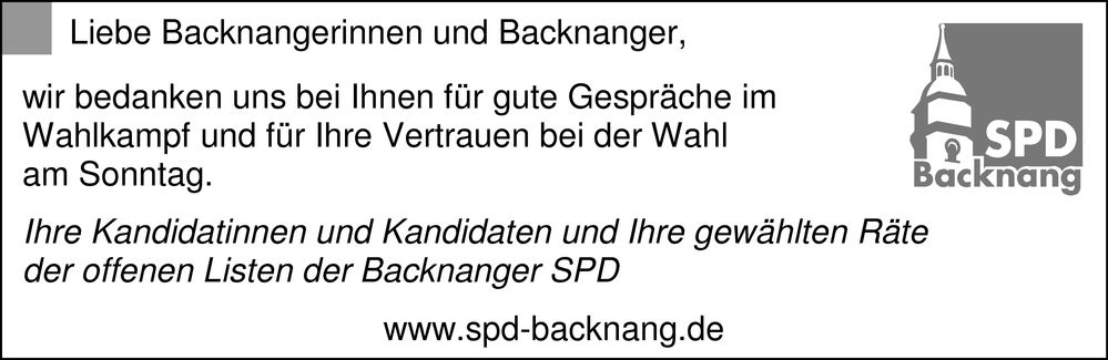 Backnangs Sozialdemokraten hatten das größte Plus an Prozenten, leider kein Plus an Mandaten.Herzlichen Glückwunsch allen Gewählten.