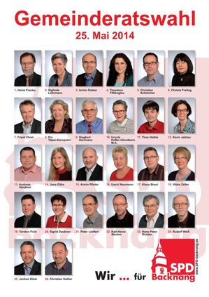 Hier finden Sie unser Plakat zur Gemeinderatswahl 2014, auf dem alle Kandidatinnen und Kandidaten der offenen Liste der Backnanger SPD vorgestellt werden.